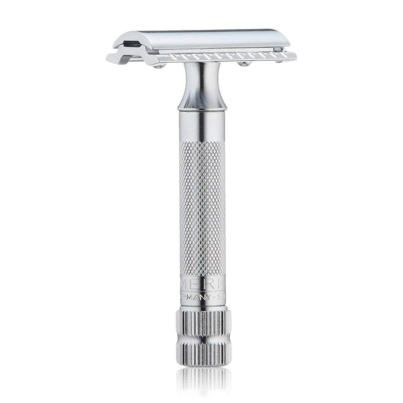 One of our most popular items, the Merkur 34 C Heavy Duty Safety Razor is a chrome finished 2 piece DE razor. The comfortable handle is approximately 3" long and is designed with a thicker grip with non slip knurling. One of the most well known wet shaving products on the market.